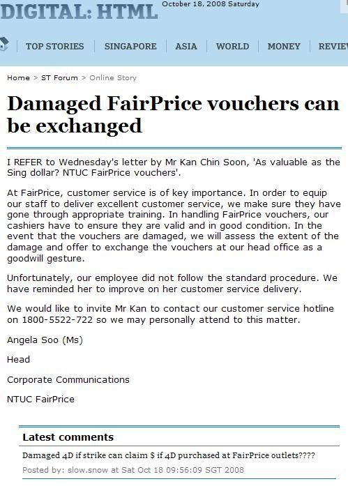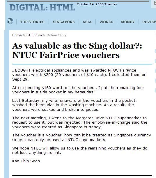 Talk about being a stupid fool, Mr. Kan. If you accidentally destroyed the vouchers, and all you bring to the cashier at the check-out counter is a heap of colored paper which looks like the remains of your 4 x $10 vouchers, and they still let you redeem the vouchers, then I can do the below: